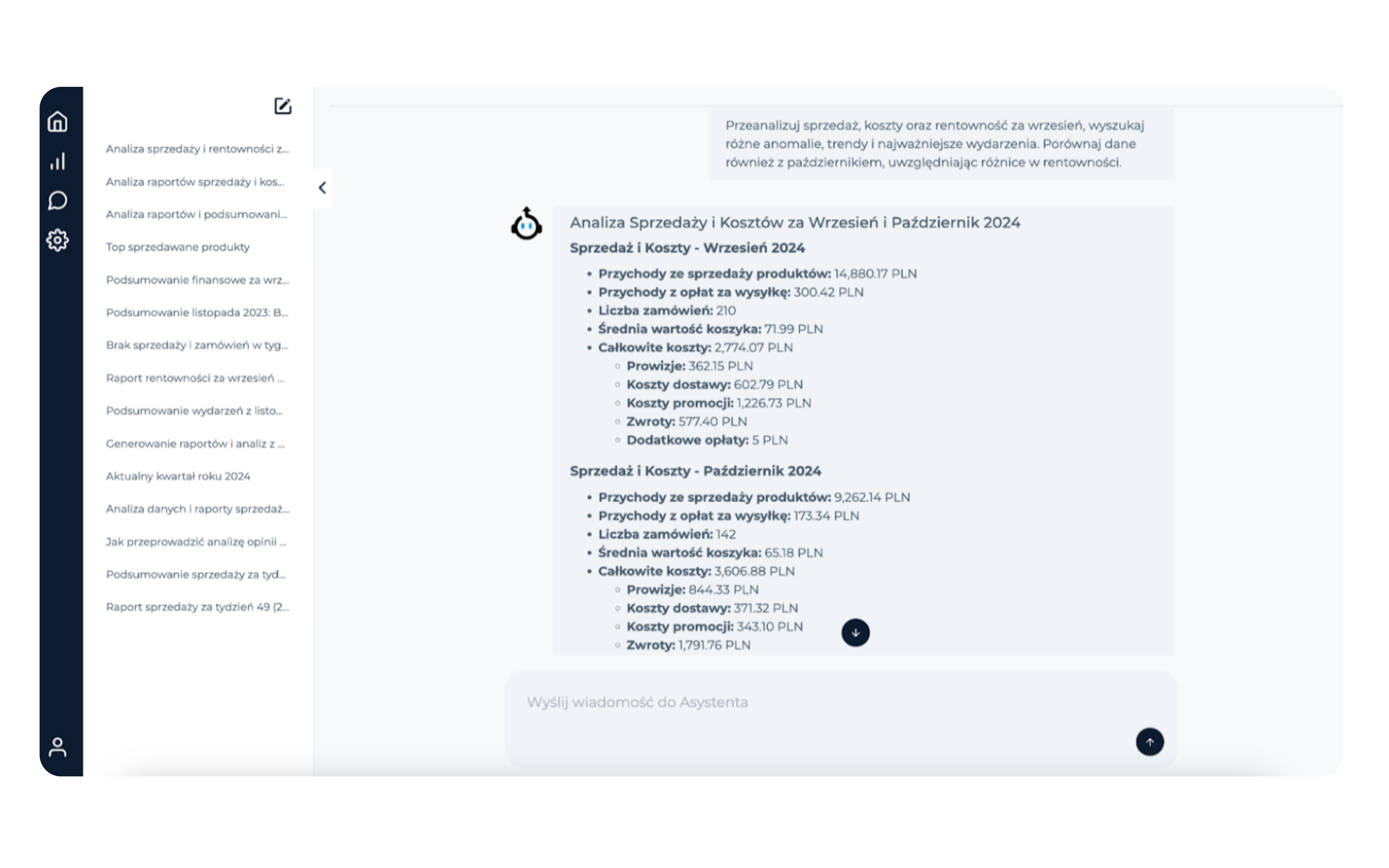 Asystent AI analizuje wyniki sprzedaży, kampanie i ceny, tłumacząc, co naprawdę wpływa na Twoje wyniki.