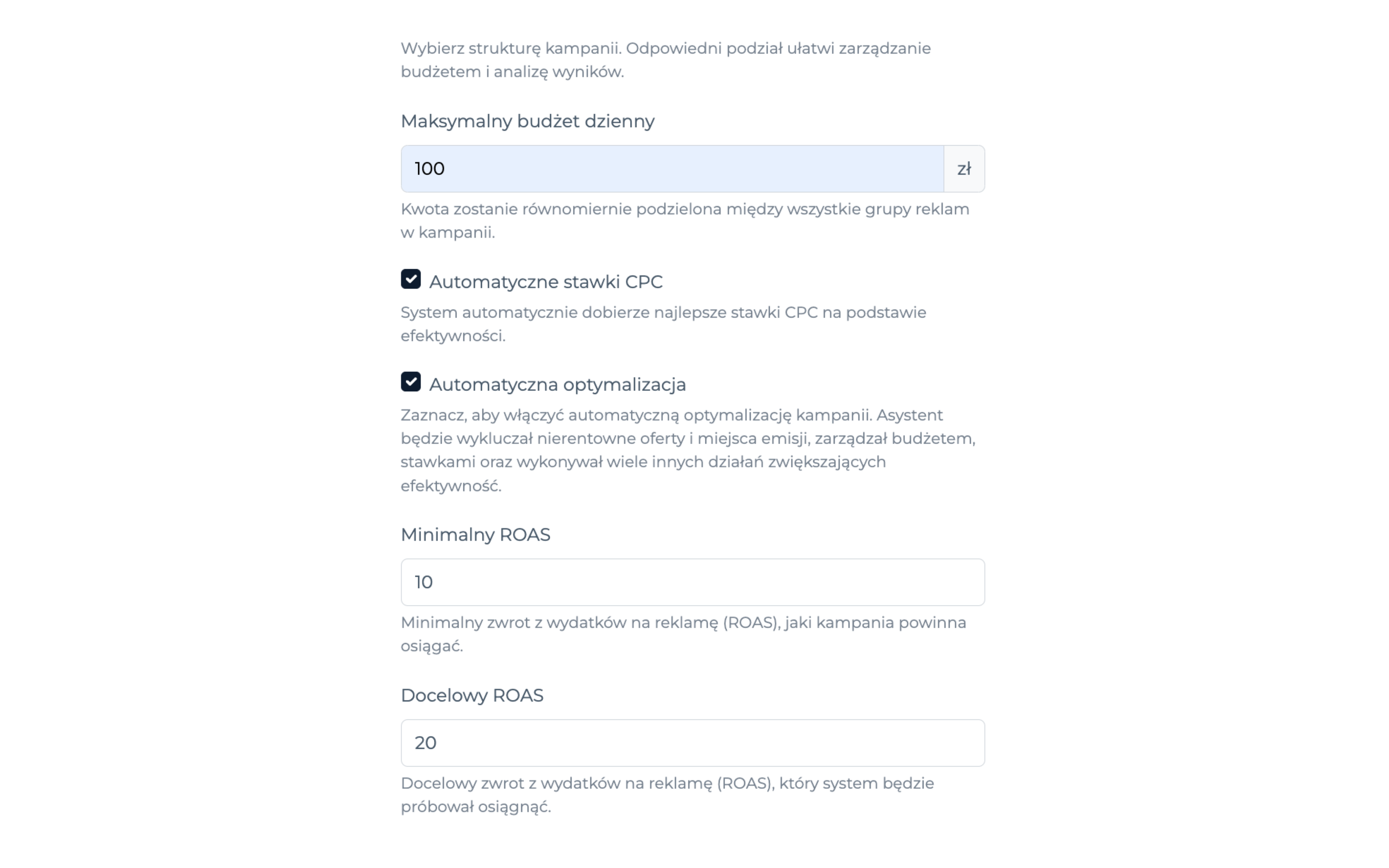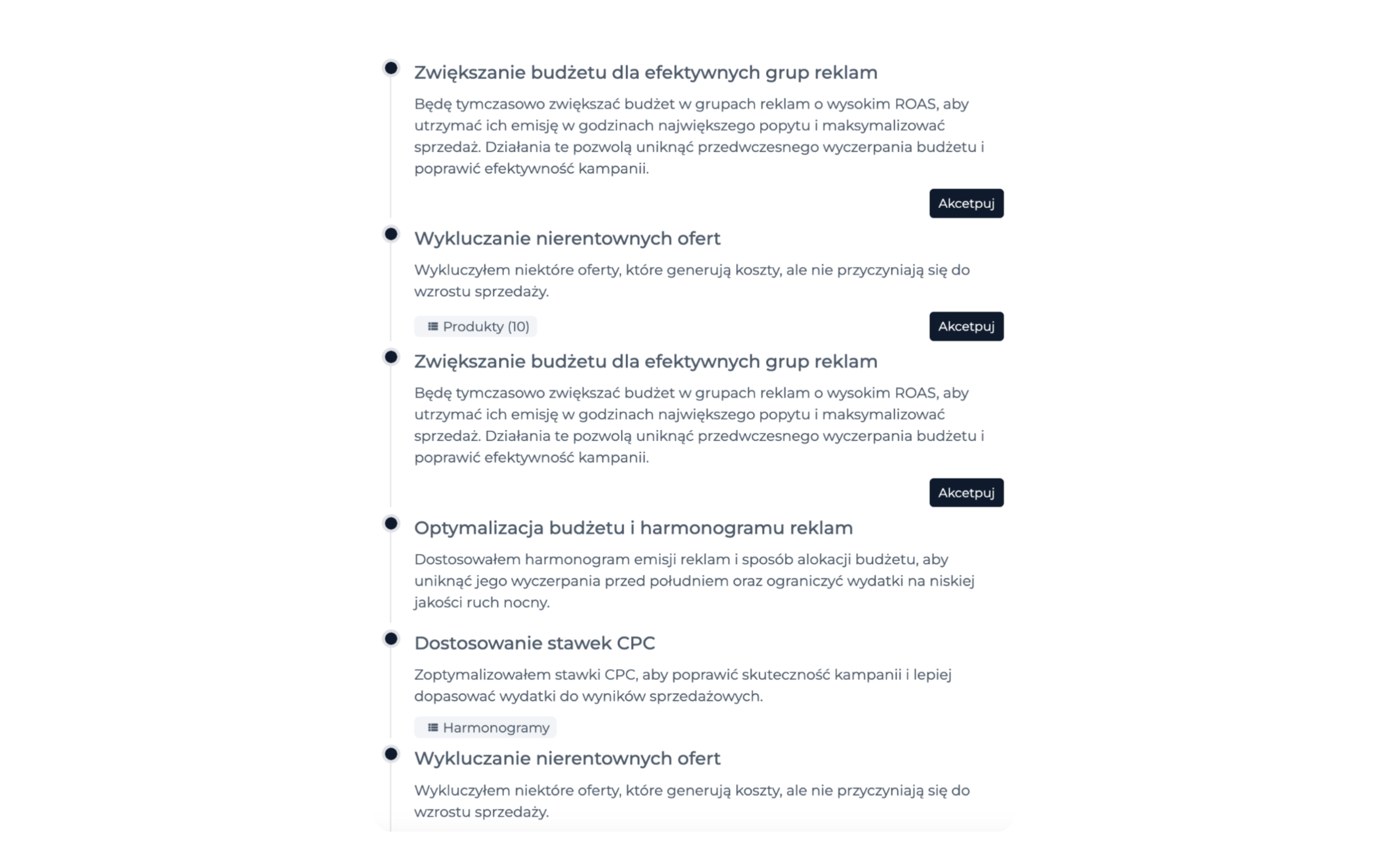 Moduł kampanii AI automatycznie analizuje skuteczność reklam i dostosowuje stawki, budżety oraz grupy ofert.